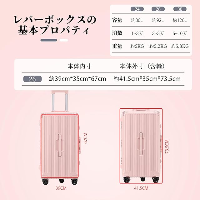 【スーツケースの仕様】キャスターを含めているサイズは以下です、24寸: 41.5cm*34cm*68cm。26寸: 41.5cm*35cm*73.5cm。30寸:45.5cm*37cm*85.5cm。キャスターを含めないサイズは以下です、24寸: 39cm*34cm*62cm,26寸: 39cm*35cm*67cm,30寸:43cm*37cm*78.5cm注意:手作業による測定のため、サイズは1~2cmの誤差がありますので、ご了承ください。