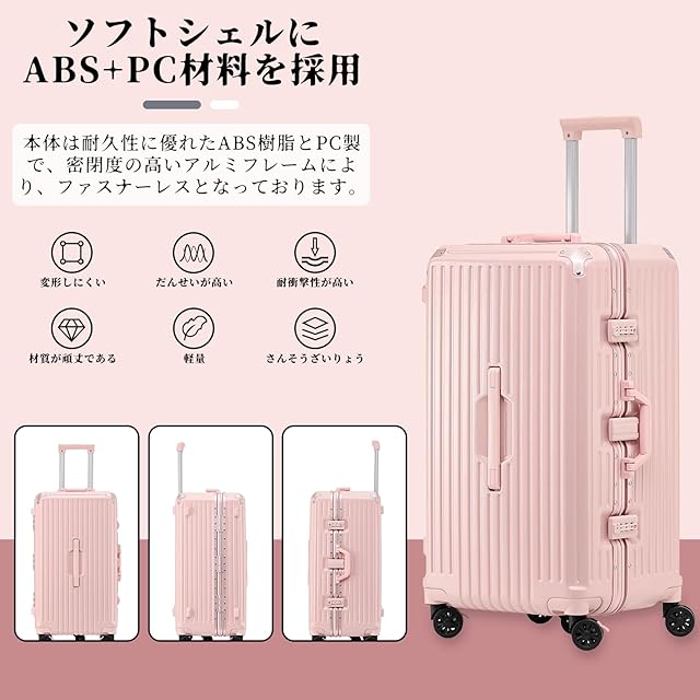 【材質&TSAダイヤル式ロック】スースケースはPC素材を採用し、耐衝撃性に優れた上、高弾性で、変形しにくい。エンボス加工、傷つきにくい。ABS素材より頑丈で耐久性に優れ、アルミフレームスーツケースより軽量で持ち歩きやすい。TSAダイヤル式ロックが搭載されて、外出がより安全。また、鍵穴は航空会社検査専用の物です。本製品に鍵は付属しておりません。