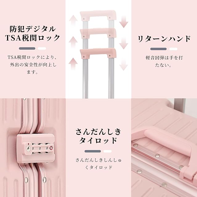 【三段調節キャリバー&柔軟ハンドル+ 移動式USBポート】超軽量のアルミニウム製キャリバー、高さ三段階調節、ご自分の身長に合わせてスムーズに調整が可能です。耐振性に優れるデザインで荷物を引きかける時、しっかりしています。また、滑りにくいソフトハンドルで長い時間の手提げでも手は疲れません。スーツケースはUSB、Type-c充電ポートがあります。スーツケースの内部にモバイルバッテリーを収納するポケットがついており、モバイルバッテリーを出し必要がありません、歩いながらスマホを充電することができます。また、充電ポートには防水カバーが付いているので、雨の日の旅行でも心配する必要はありません。