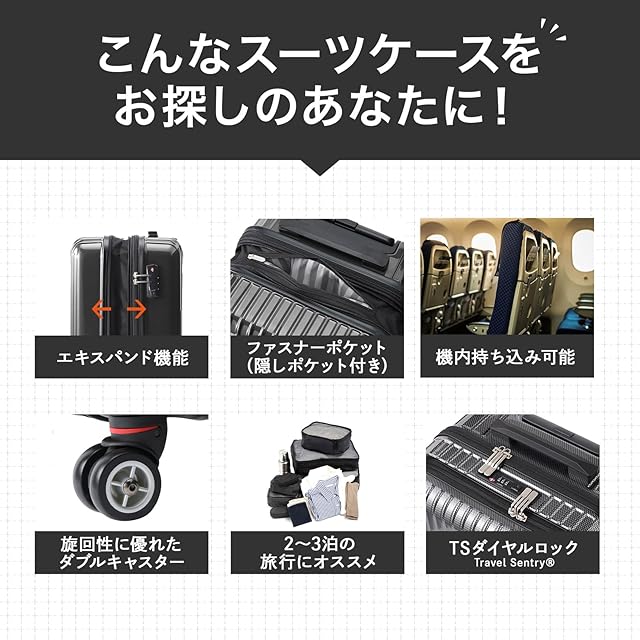 エース スーツケース キャリーケース キャリーバッグ 機内持ち込み sサイズ 1泊2日 2泊3日 34L/39L(拡張時) 容量拡張機能 双輪キャスター 3.2kg クレスタ No.06316