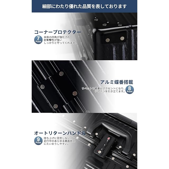 【真四角コーナーパッド&アルミフレームのリベット設計】アルミニウムマグネシウム合金素材を使用するので、デザインと衝撃を受けるコーナーをしっかりとガードします。 キャリーケースのアルミフレームは機能性とファッション性の両立を実現できます。スーツケース全体の品質感を向上させることができます。