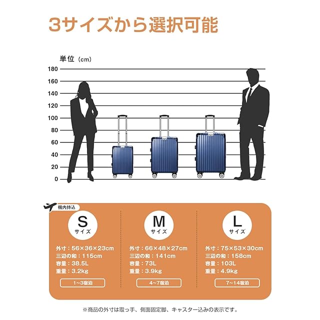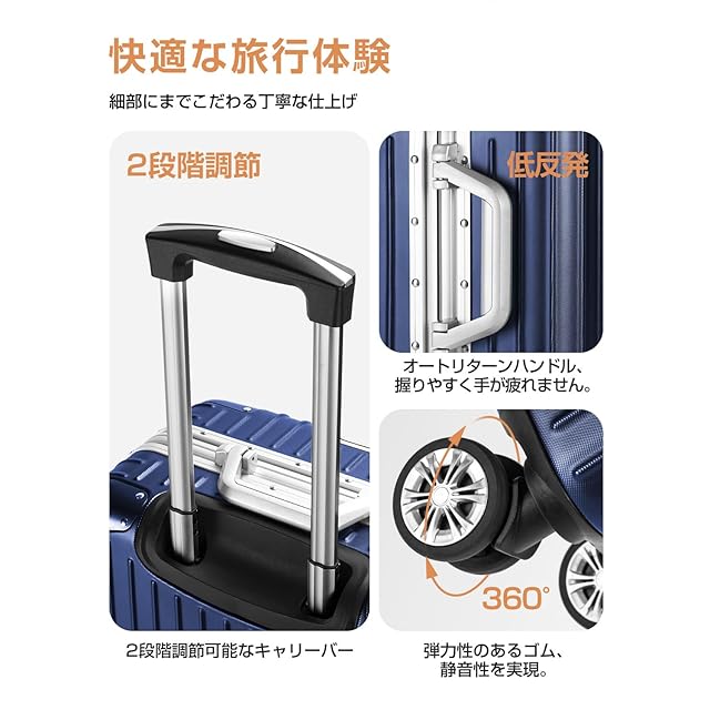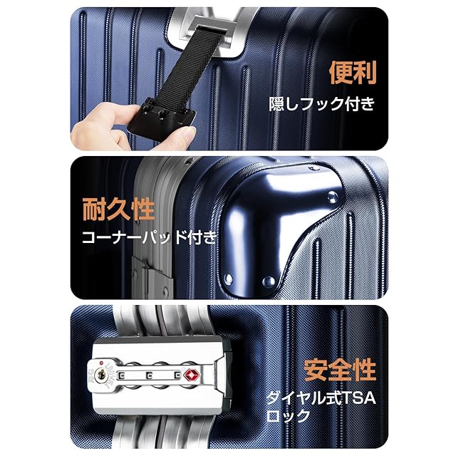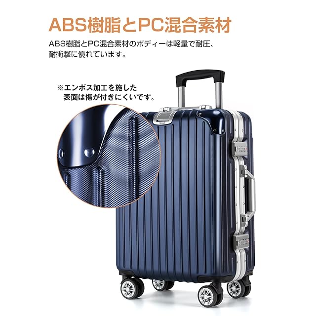 【改良されたアルミフレーム&ボディー素材】スーツケースは強化アルミフレームを採用し、従来のファスナータイプに比べ、高級感があって頑丈です。また、スーツケース本体の形状維持を強化させ、耐衝撃性と耐久性を向上させます。ボディーはABS樹脂とPCの混合素材で作られ、耐衝撃性に優れています。エンボス加工を施し、傷つきにくいです。