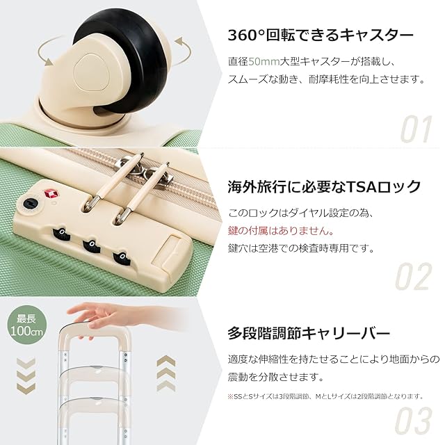 【TSAロック&5年間品質】ファスナータイプではなく、旅行箱は世界基準施設TSAロックを搭載するので、施錠したままで預けることができて、トラベルに安心できます。本体の鍵穴はTSA職員の検査用ですので、お客様には付属の鍵はございません。本製品には5年間品質を提供します。使用中に何か問題があれば、商品を開封しても、お気軽にお問合わせてください。