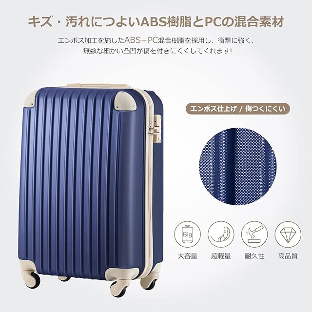 【サイズ】 SSサイズ(機内持込) 外寸:約52.5x34.5x22.5cm 内寸:約47x33.5x20cm 重量:約 2.65 kg 容量:約 31.4L 1~3泊に似合います。 Sサイズ 外寸:約37x56x24cm 内寸:約35x50x23cm 重量:約 2.8 kg 容量:約 40.2L 1~3泊に似合います。 Mサイズ 外寸:約65x43x26cm 内寸:約58x41.5x26cm 重量:約 3.3kg 容量:約 62.6L 4~7泊以上。 ※Sサイズは一部の航空会社だけに適用しますので、事前に航空会社に確認したほうがいいんです。 【表面素材】スーツケースはABS樹脂とPCでの混合素材を採用しており、純ABS樹脂より耐衝撃性に優れています。エンボス加工、傷つきにくい。縦縞デザインにより、シンプルかつファッションです。超軽量で携帯便利、女性でも楽々に持ち出かける人気なキャリーケースです。
