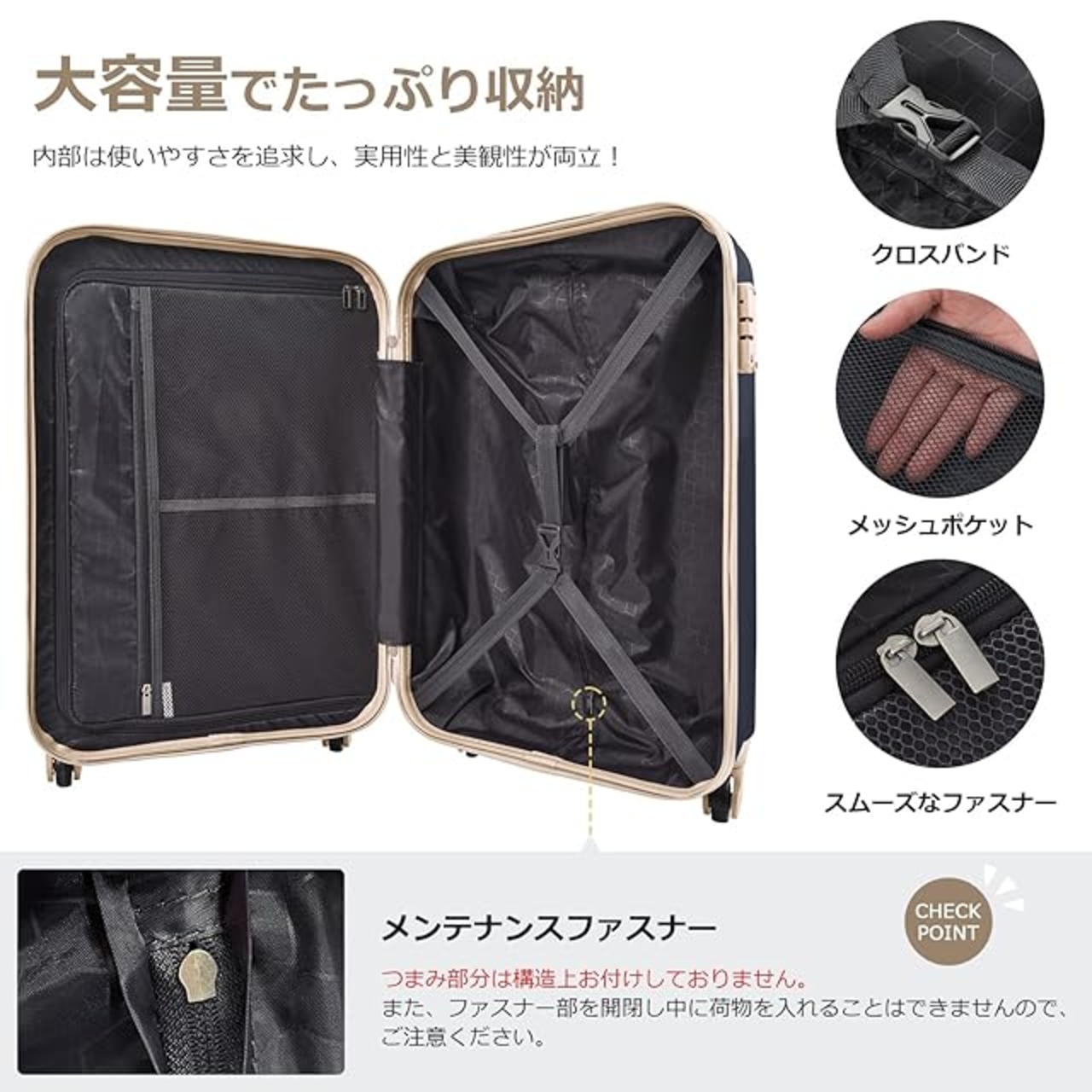 超軽量:女性でも軽々と持ち上げることができる驚きの軽さ。軽量だから階段もラクラク。軽量スーツケースは海外旅行の、重さ制限にも有利。