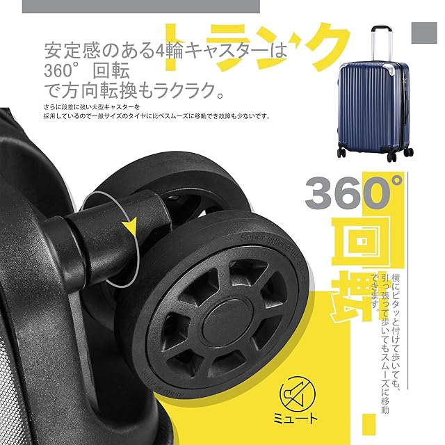 【消音設計キャスター】消音キャスターで早朝や夜間の持ち運びも安心です。ダブルキャスターは操作性のスムーズな360度回転12輪独立サインレントキャスターです。