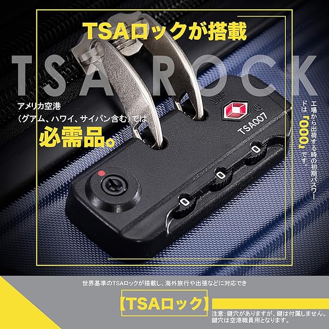 【TSAロック】世界基準施設TSAロックが搭載し海外旅行や出張などに対応 。工場から出荷する時の初期パスワードは「000」です。アメリカ空港(グアム、ハワイ、サイパン含む)では必需品。警告:こちらのタイプのTSAロックはダイヤル式です。鍵穴がありますが、鍵は付属しません。鍵穴は空港職員用となります。