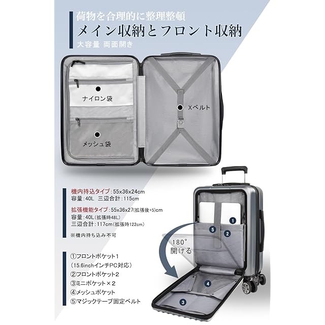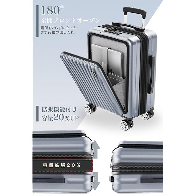 【フロントオープン&拡張機能付き】立てたまま荷物の出し入れができる便利なフロントオープンスーツケースです。15.6インチまでパソコンやタブレット、パスポートなど荷物に合わせた細かなポケットがあり、空港や新幹線の中、旅の途中でも、前ポケットから出したいものを簡単に取り出すことができ、子連れの方やビジネスシーンでも活躍しています。スーツケースの拡張ジッパーを開けるだけで、マチ幅が5cm広がり、容量が20%増加。必要なときにすぐにスペースを拡張でき、旅行の柔軟性を高め、効率的に荷物を収納できる便利な機能です。