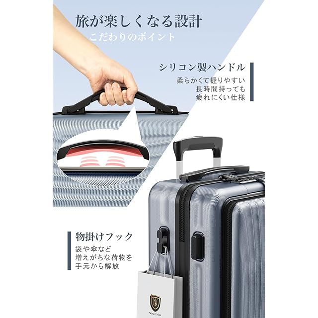 【安心のTSAロック&物掛けフック付き】世界基準のTSAロック搭載しています。アメリカ空港(グアム・ハワイ・サイパン含む)では必需品です。ダイヤル式ロックなので鍵を無くす心配がないのも魅力です。また、キャリーケースのボディ側面に手提げ袋など掛けられるフックを搭載しています。外出中増えがちな荷物を、手持ちから解放してくれる便利機能です。