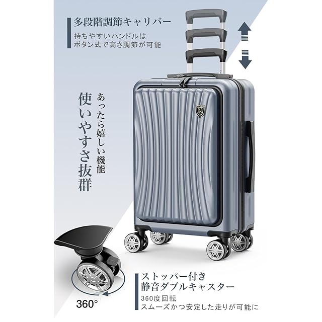 【ストッパー付き静音キャスター&USB充電ポート付き】360度回転可能の8輪ダブルキャスターは、静音と耐久性抜群で、凸凹道でもスムーズに走ることができます。また、ストッパーが付いているため、坂道や電車内などスーツケースを止めたい時に便利です。便利なUSB充電ポート付き、場所を選ばずいつでもどこでも移動しながら効率よく充電ができます。