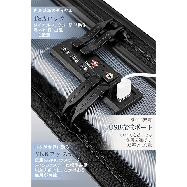 [New Trip] スーツケース フロントオープン 拡張機能付き キャリーケース Sサイズ USBポート付き ストッパー付き YKKファスナー TSAロック 静音 ダブルキャスター ビジネス 出張 2-4泊 48リットル グレー色