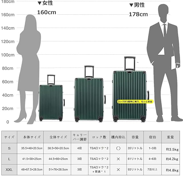 【サイズ】Sサイズの内寸は48*35.5*20.5cm、容量は35リットル、1~3泊に似合います。Sサイズは一部の航空会社だけに適用しますので、事前に航空会社に確認したほうがいいんです。Mサイズの内寸は50*38.5*22.5cm、容量は48リットル、2-4泊以上。Lサイズの内寸は41.5*58*25cm、容量は61リットル、4-6泊以上。XLサイズの内寸は62*45.5*26.5cm、容量は78リットル、5-7泊以上。XXLサイズの内寸は67.5*48*28.5cm、容量は93リットル、7泊以上
