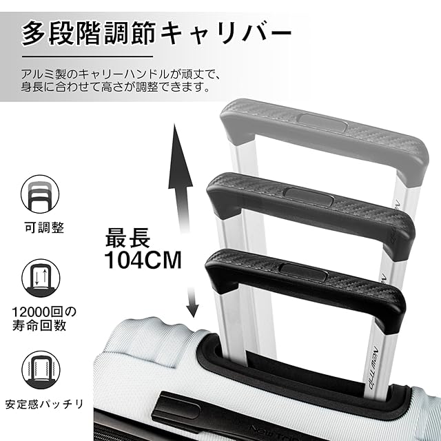 【多段調節キャリーバー&握りやすい2層ハンドル】アルミ合金製の超軽量のキャリバーは伸縮可能で、ご自分の身長に合わせて、最適な高さに調節できます。2層式で設計されたハンドルは、手に当たる部分に柔らかい素材を使用しており、荷物を入れた状態でも手に食い込みにくく長時間持っていても手が痛くなりにくいのが特徴です。