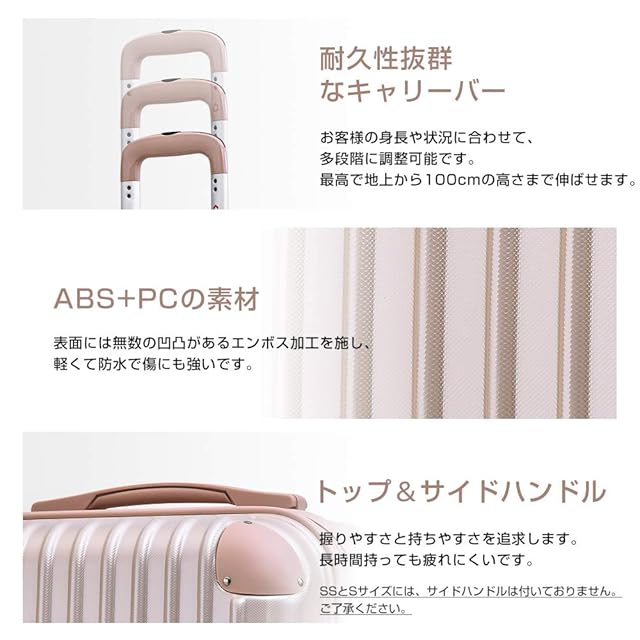 軽量なので重さ制限に有利で、女性の方でも軽々と持ち上げることができます。【TSAロック】海外旅行には欠かせない世界基準のダイヤル方式のTSAロックを採用しています、国内外にも関わらず、航空便をご利用する際に便利で、より安全で便利です。※ご注意:鍵は付いておりません。予めご了承ください。ご注意!!:SS、S、容量UP--SSと容量UP-Sサイズは寸法のため、側面のハンドルと底足が付いていません。そして、コーナープロテクトが二箇所しか装備しないです。