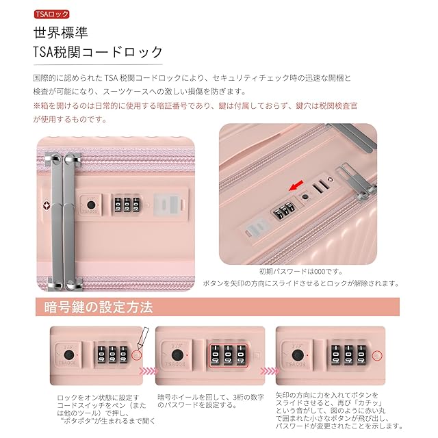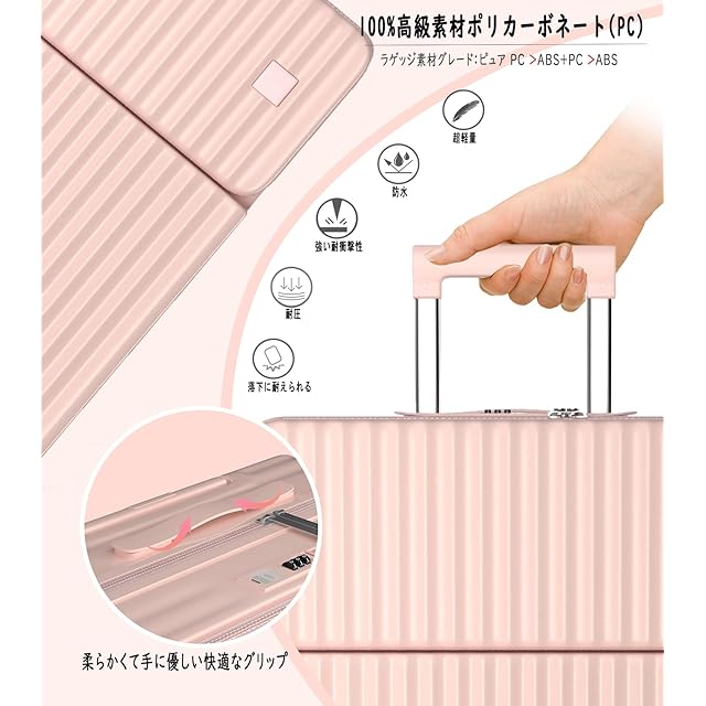 【丈夫かつ軽いPC素材&TSAダイヤル式ロック】表面素材は高耐衝撃性を持つPC(ポリカーボネート)を100%使用。高弾性で、変形しにくい。ABS素材を採用した市販品より頑丈で耐久性に優れ、ABS+PCスーツケースより軽量で持ち運びやすい。PC 素材は、現在市場で最も一般的に使用され人気のあるハードシェル ラゲッジであり、防水性、耐摩耗性、スタイリッシュさ、耐衝撃性、落下耐性を備えています。世界基準のTSAダイヤル式ロックが搭載されて、外出がより安全に。※鍵は航空会社検査専用のため本製品には付属しておりません。