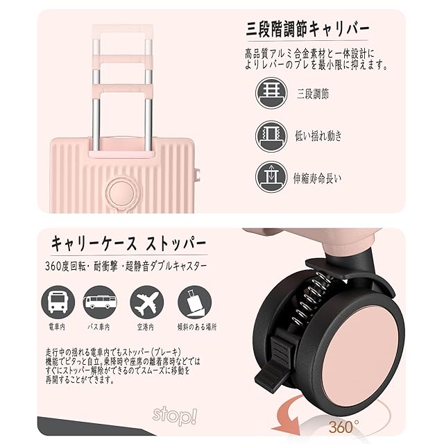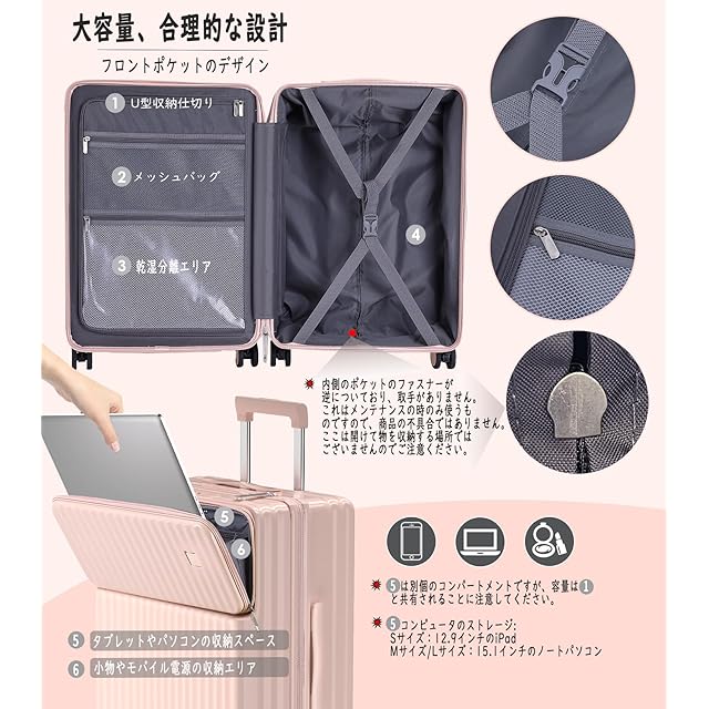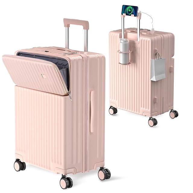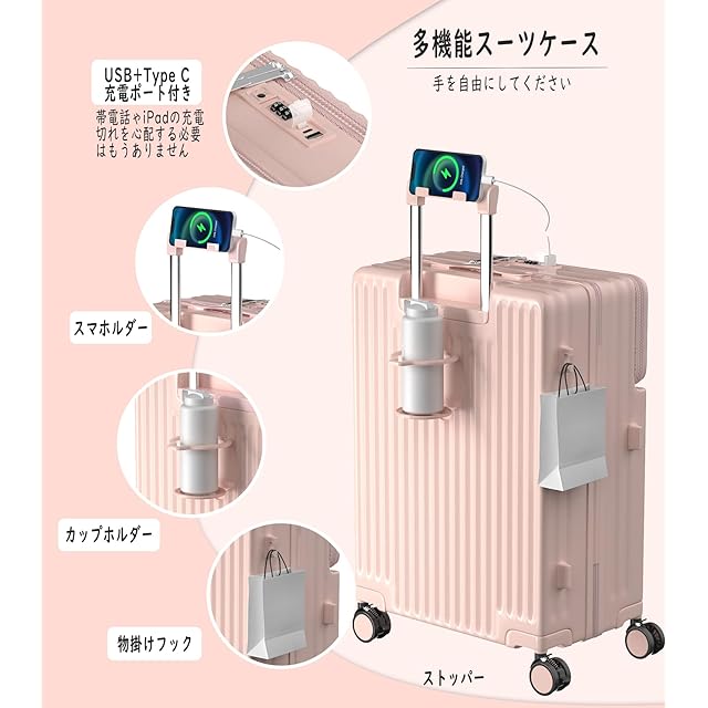 [Ashard] キャリーケース 多機能 スーツケース ストッパー付き Type C と USBポート付き フロントオープン ジッパー キャリーバッグ 携帯スタンド カップホルダー付き 隠しフック機能 超軽量 耐衝撃 静音 360度回転キャスター 100%PC材質 人気 頑丈 可愛い TSAロック搭載 旅行 ビジネス 出張 修学 (Mサイズ/4~7泊/65L/託送必要, ピンク)