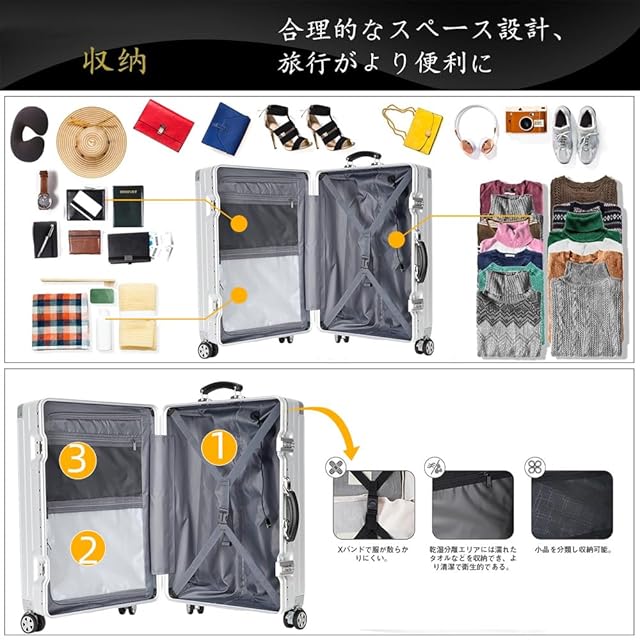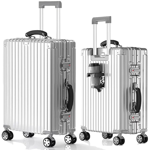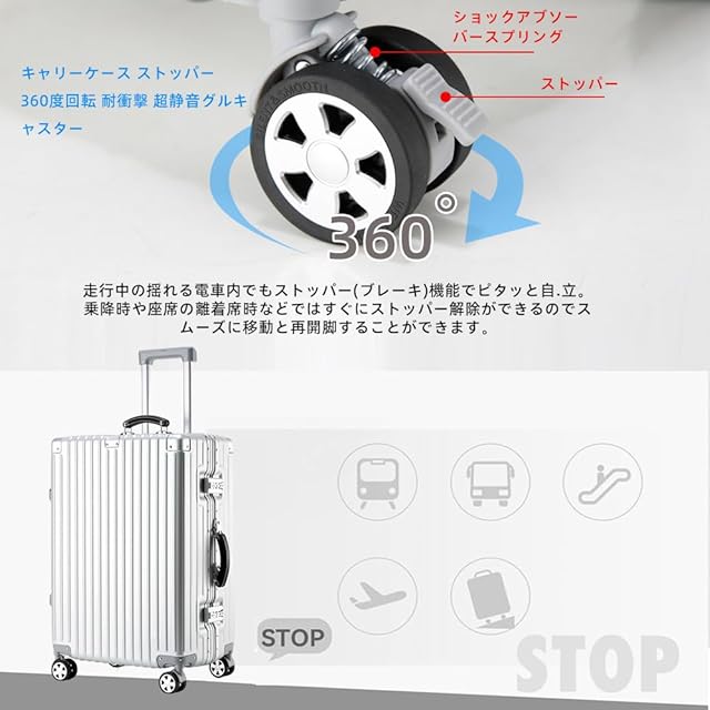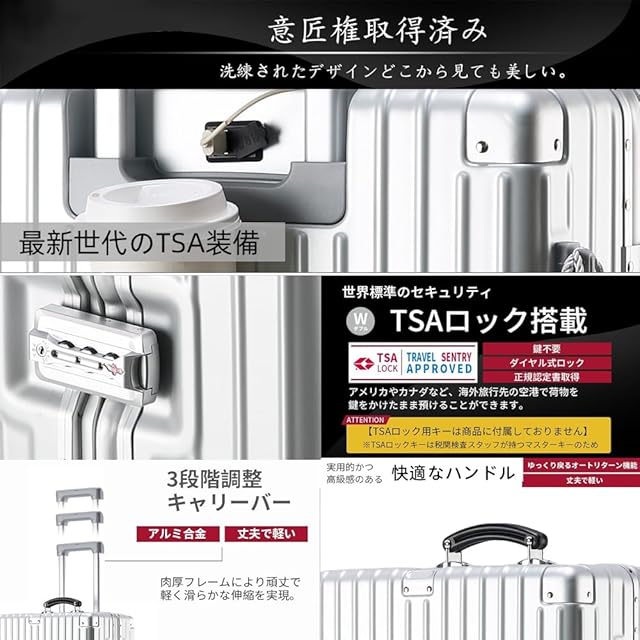 【世界標準のTSAロック&アルミニウム製レバー&360°静音ブレーキ付きホイール】20インチの搭乗可能なスーツケースには、最新の最先端技術である携帯電話充電機能付きTSA税関ロックが搭載されており、ボタンを押すとスーツケースの前面開口部の蓋が開きます。20インチ、24インチ、27インチには世界標準のTSAコンビネーションロックが搭載されており、非常に頑丈なので、スーツケースの使用中や運搬中にスーツケースが破損したり、欠けたりする心配がありません。 アルミニウム製トロリーバーは、丈夫で軽量、錆びない最高のトロリーバー素材です。360°静音ブレーキ付きホイール(ブレーキパッド装備),走行中の揺れる電車内でもストッパー(ブレーキ)機能でピタっと自立。乗降時や座席の離着席時などではすぐにストッパー解除ができるのでスムーズに移動を再開することができます。