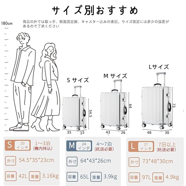 【丈夫かつ軽量PC素材&TSAダイヤル式ロック】表面素材は高耐衝撃性を持つPC(ポリカーボネート)を100%使用。高弾性で、変形しにくい。小さな傷などは正規品の範囲内でしています。世界基準のTSAダイヤル式ロックが搭載されて、外出がより安全に。※鍵は航空会社検査専用のため本製品には付属しておりません。パスワードの設定方法については、メインビデオをご覧ください。ロックが開かない場合は、当社までご連絡ください。