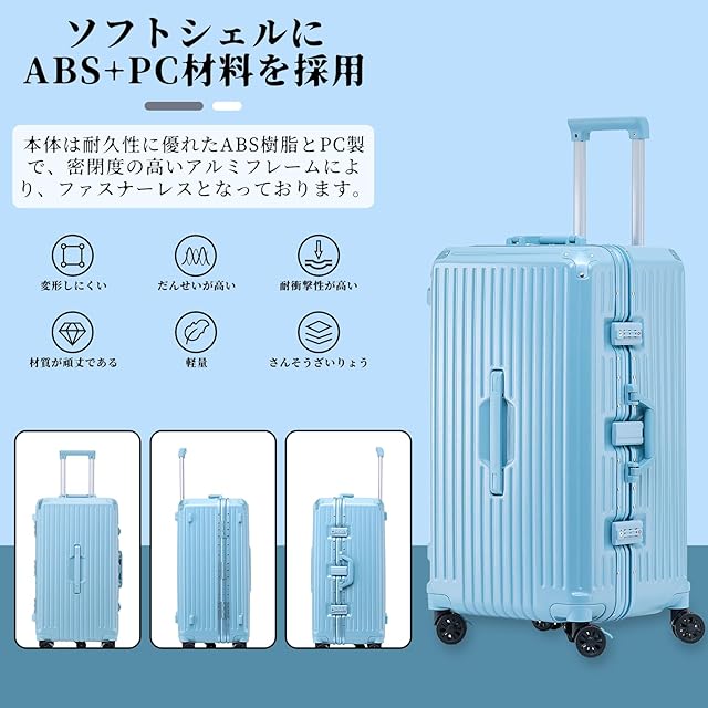 【材質&TSAダイヤル式ロック】スースケースはPC素材を採用し、耐衝撃性に優れた上、高弾性で、変形しにくい。エンボス加工、傷つきにくい。ABS素材より頑丈で耐久性に優れ、アルミフレームスーツケースより軽量で持ち歩きやすい。TSAダイヤル式ロックが搭載されて、外出がより安全。また、鍵穴は航空会社検査専用の物です。本製品に鍵は付属しておりません。