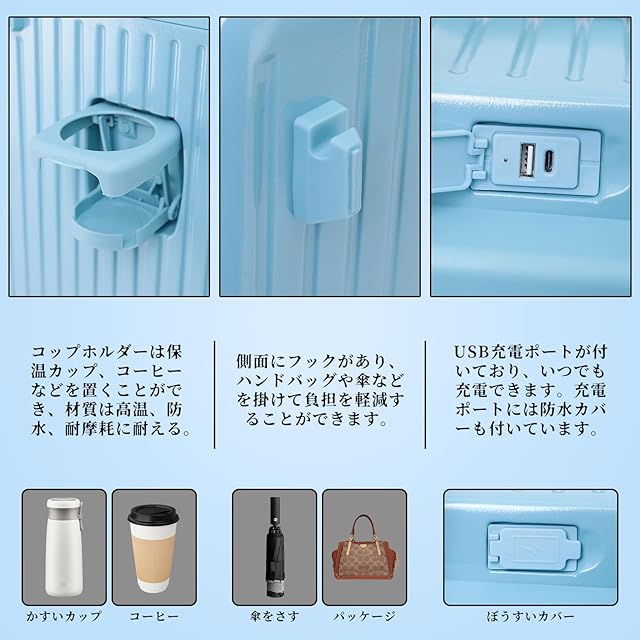 【カップホルダー+サイドフック】スーツケースの背面にカップホルダーがあり、飲み物、傘などの小物を簡単に取り出せる。折りたたみ可能なデザインは外観に影響を与えません。サイドにフックが付いているので、ハンドバッグやギフトバッグなどの荷物を掛けることができ、旅行時の負担を軽減します。
