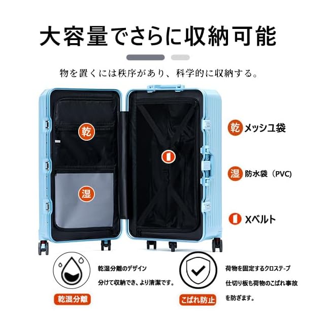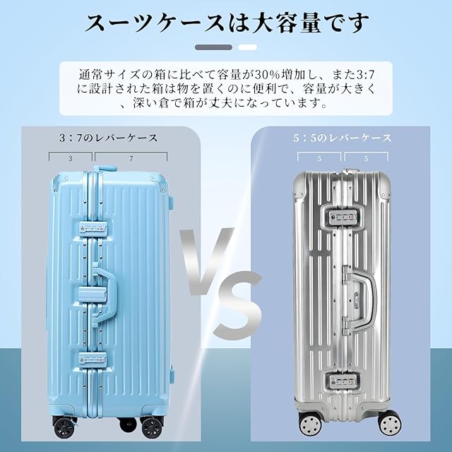 【革新的な3:7の型で スーツケース】収納スペースが、展開すると半分個づつの大きさのキャリーケースと違い、革新的な3:7の型で、深めの半分、ヘルメットや小型炊飯器、靴など、通常のスーツケースには入らない荷物も立てて入れられて、 もう片方に細かいモノを入れたりと、スッキリと収納が出来ます。インナーカバーがありますが、はずせばギリギリまで荷物を詰められます。乾湿分離のデザイン、分けて収納でき、よりきれいです。荷物の出し入れも便利に行えます。