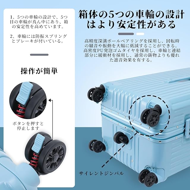 【新型5輪】5輪のキャスターで中央のキャスターがあるので、内容物を入れた際に重さを分散する様に中央のキャスターも地面にシッカリ接地して5輪で移動出来る様になっている仕組みが大変面白く実用性があります。振動防止スプリングとブレーキ付きホイール。ホイールには、スプリング振動防止機能とブレーキ機能があり、安全性を高めています。キャスターには輸入ゴム素材を使用し、低騒音システムを搭載、360°の回転が可能で、スムーズな走行と静音性を実現しました。