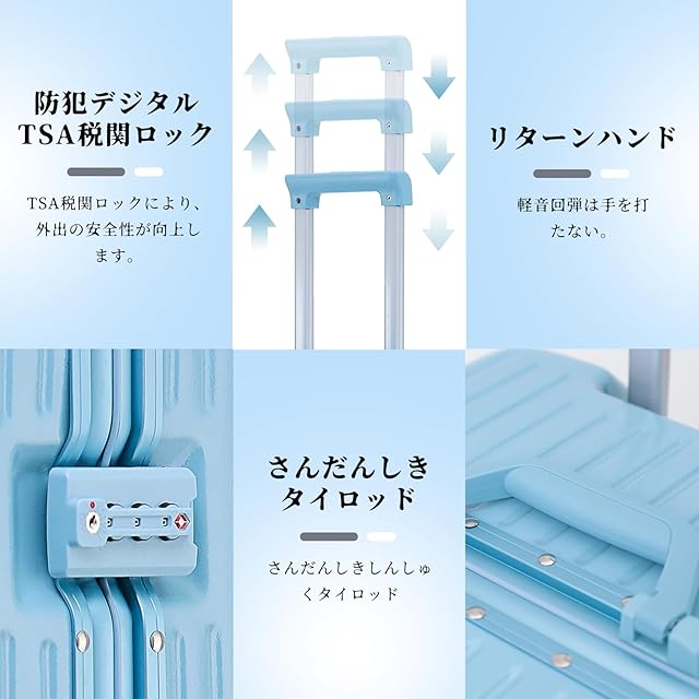 【三段調節キャリバー&柔軟ハンドル+ 移動式USBポート】超軽量のアルミニウム製キャリバー、高さ三段階調節、ご自分の身長に合わせてスムーズに調整が可能です。耐振性に優れるデザインで荷物を引きかける時、しっかりしています。また、滑りにくいソフトハンドルで長い時間の手提げでも手は疲れません。スーツケースはUSB、Type-c充電ポートがあります。スーツケースの内部にモバイルバッテリーを収納するポケットがついており、モバイルバッテリーを出し必要がありません、歩いながらスマホを充電することができます。また、充電ポートには防水カバーが付いているので、雨の日の旅行でも心配する必要はありません。