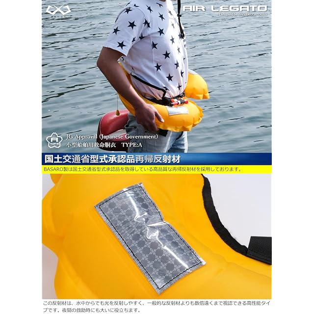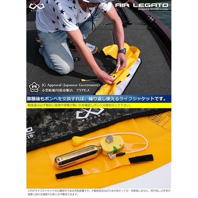 【国土交通省型式承認/桜マーク付き】BASARO 手動膨脹式ライフジャケット(TYPE:A)本製品は、救命胴衣専門メーカーBASAROが企画・製造する、国土交通省型式承認の手動膨脹式ライフジャケットです。国が定める厳格な試験をクリアし、BASAROと日本小型船舶検査機構による出荷前検査を経て、桜マークが押印された状態でお客様にお届けしています。【TYPE:Aについて】TYPE:Aは、すべての航行区域に対応したモデルで、小型船舶に乗船する全ての方に着用が義務付けられているライフジャケットです。渡船業者など、現場のプロも愛用する高い安全性能が特長です。【手動膨脹式モデルの特長】本製品は、環境条件に左右されにくく、初心者から上級者まで幅広い層に支持されている手動膨脹タイプです。※落水時に自動では膨脹しません。PULLタグを強く引くことで膨脹します。