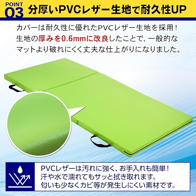 【こだわりの素材を採用】KaRaDaStyleの体操マットシリーズは品質にこだわりを持っています。10年以上の製造・販売実績があり、お客様の声より何度も品質改良を行ってまいりました。カバーは匂いを極限まで抑えた防水のPVCレザーを採用し、さらに長くお使いいただけるよう生地の厚さと縫い糸の太さも何度も改良を行いました。中身のマットはEPE発砲素材を数層に重ね、断熱性や防音性を確保。かつ、高い衝撃吸収力を持たせつつ、エクササイズにも耐えうる硬さを採用しております。他社のマットとは一線を画す品質を是非お試しください。