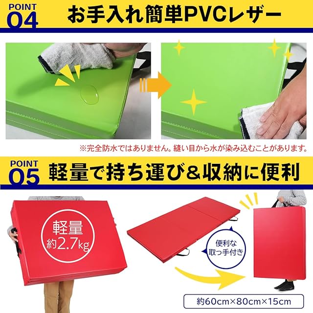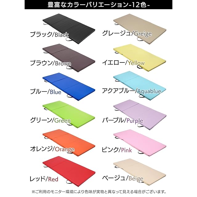 【サイズ/重量】180*80*5cm(折り畳み時:80cm×60cm×15cm)、重量:約2.7kg 【素材/材質】マット;EPE、カバー;PVCレザー 【カラー】ブラック、ブルー、ベージュ、グリーン、パープル、ブラウン、アクアブルー、グレージュ、オレンジ、イエロー、ピンク、レッド 【セット内容】ストレッチマット単品