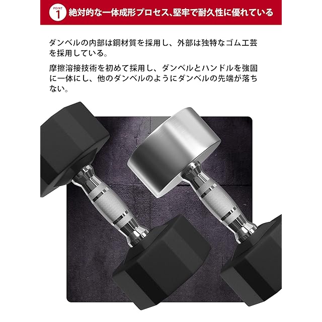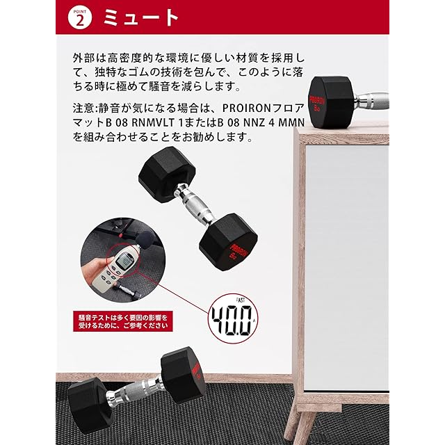 【特長】PROIRONのダンベルは、独自の摩擦圧接技術により一体成形を実現し、部品が外れることはありません。ゴム製で、強度と環境に優しさを兼ね備え、異臭も発生しません。視認性の高いロゴと重量表示、そしてローリング防止デザインが使いやすさを追求。手に汗をかいても握りやすく、滑らない安全設計。鉛とフタル酸エステルの使用はありません。