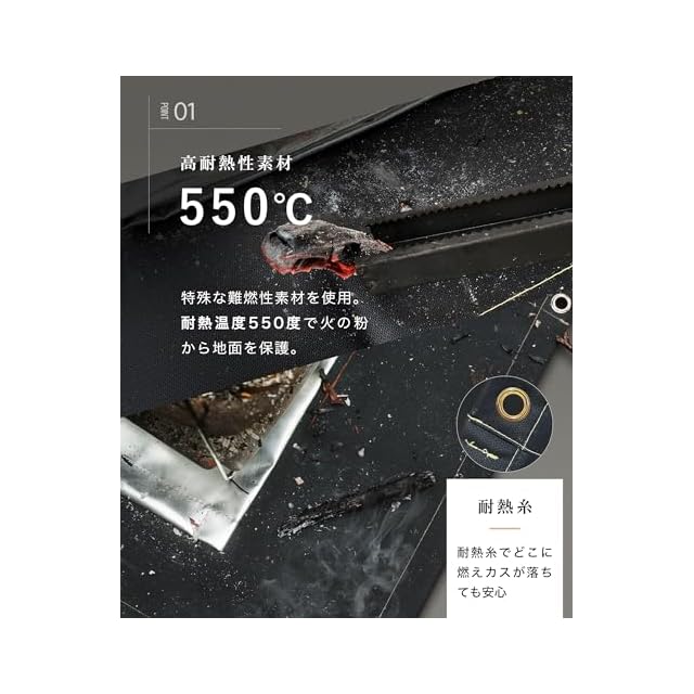 素材:シリコン加工ガラス繊維。シリコン加工によって、ガラス繊維特有の手に感じるチクチクとした痛みはなく、手触りが良いためガラス繊維が苦手な敏感肌のユーザーにおすすめのシートです。また撥水性もあるので地面が濡れた場所でも使用可能で水洗いもできます。 縫製に使用する糸も難燃性のものを使っているので糸の部分に火の粉が落ちても糸が切れることはありません。
