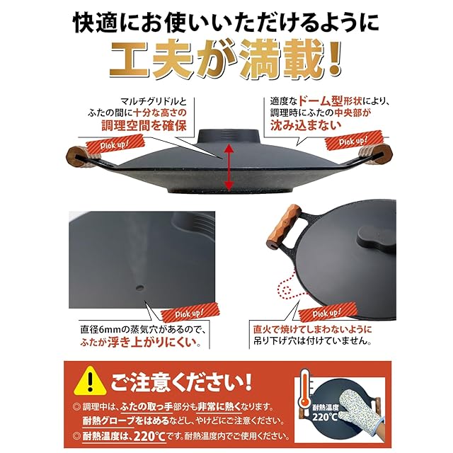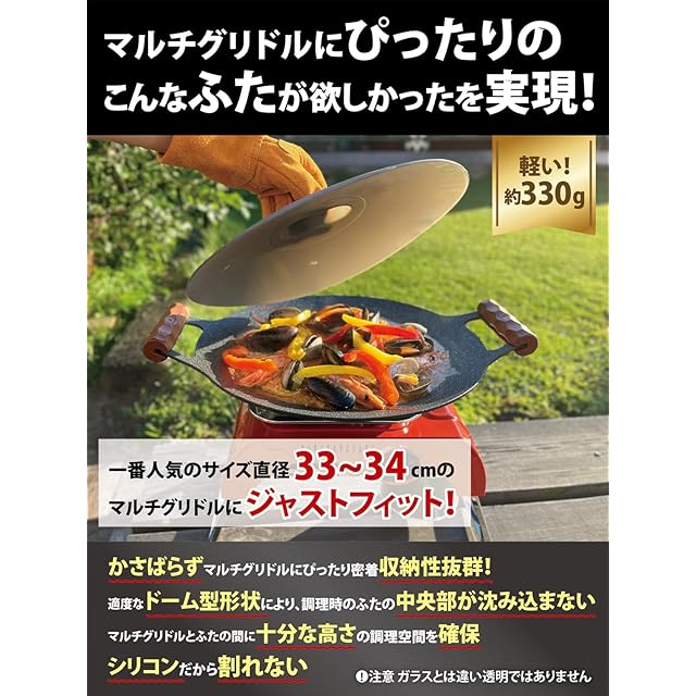 ふたがあるとマルチグリドルの料理の幅が広がる マルチグリドルのために設計・開発したシリコンふた「グリフィット01」 加熱調理時に、ふたが沈み込まない!(特殊設計で特許出願中) 適度なドーム型なので、マルチグリドルとの間の調理空間が広い 収納時は、ペコッと反り返すことで、マルチグリドルにぴったりフィットしてコンパクトに 軽い、割れない、アウトドアに最適! Far Northのマルチグリドルに最適なサイズですが、他社の33cmのマルチグリドルにもご使用可能