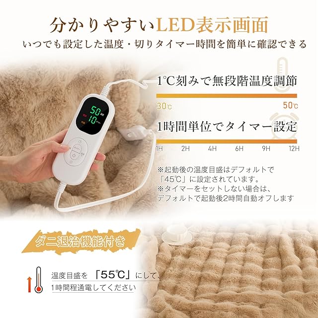 【ダニ対策】電気毛布のダニ退治機能は、主に高温を利用してダニを駆除する役割を果たします。電気毛布 敷きは「ダニ退治モード」が搭載されており、このモードを起動すると、電気毛布は一定時間(通常は 2~6 時間程度)、ダニの生存に適さない高温(約 50℃前後)に設定された領域を均一に加熱します。 また、この高機能な電気毛布では、高温加熱に加えて、銀イオンなどの抗菌成分を布地に配合することで、ダニの繁殖を長期的に抑制する効果も付加しています。使用時には、ダニ退治モードの動作時間や推奨使用頻度(例:1 ヶ月に 1~2 回)を製品の説明書に従って確認し、安全かつ効果的に利用することが重要です。