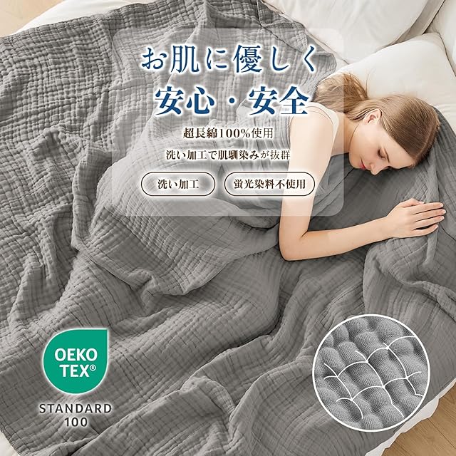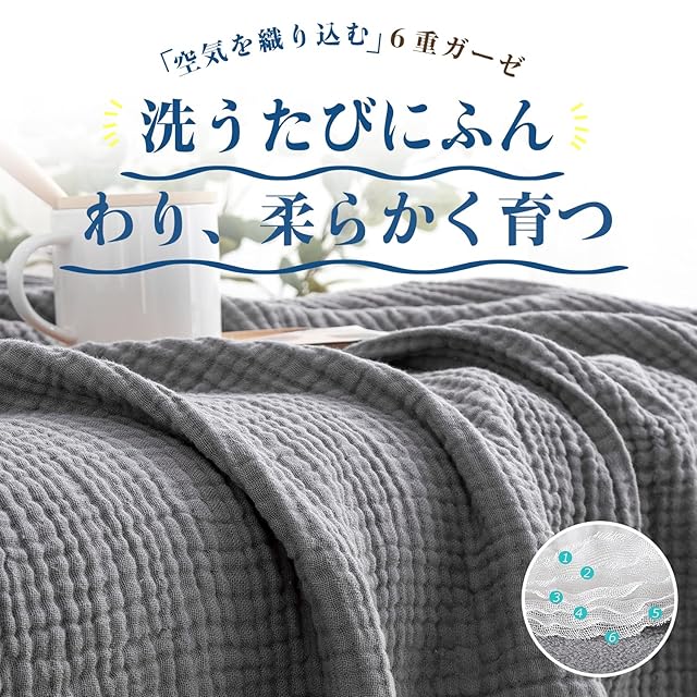 【天然素材でお肌に優しい】化学物質を添加していない100%綿製の天然素材で肌に負担をかけない! 「とろけるような肌触り(6重ガーゼ)」通気性に優れる薄いガーゼを6枚重ねて層にした寝具なので、ふんわりやわらか、肌かけ・肌触りもやさしく、軽い掛け心地になり、デリケートな肌の人や赤ちゃん・ベビーにもお使いいただけます。