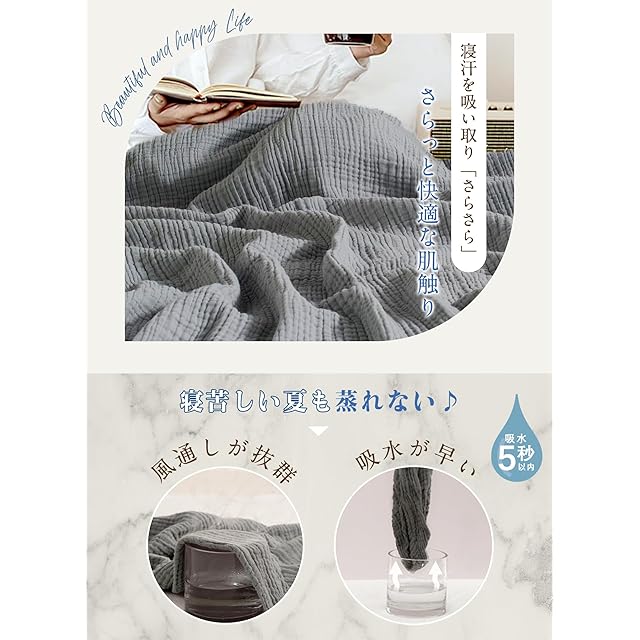【吸水速乾】吸湿性と速乾性の良い綿100%で作られてきたガーゼなので、汗を素早く吸い取って放出して、蒸し暑い夜に寝汗をかいても蒸れずにさらっと快適に過ごせます。「冷房対策」ガーゼ生地を6重にしたことでやわらかい肌触りはもちろん、真夏にエアコンをつけても寒くはしません。