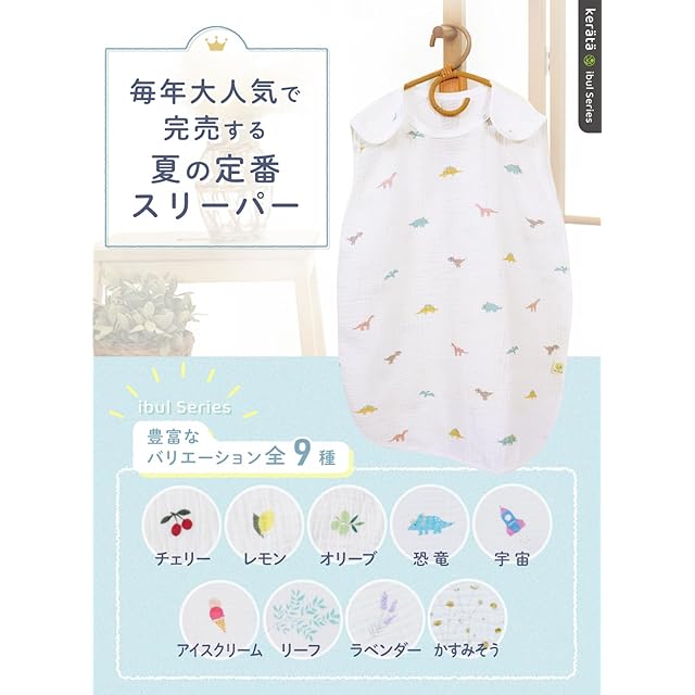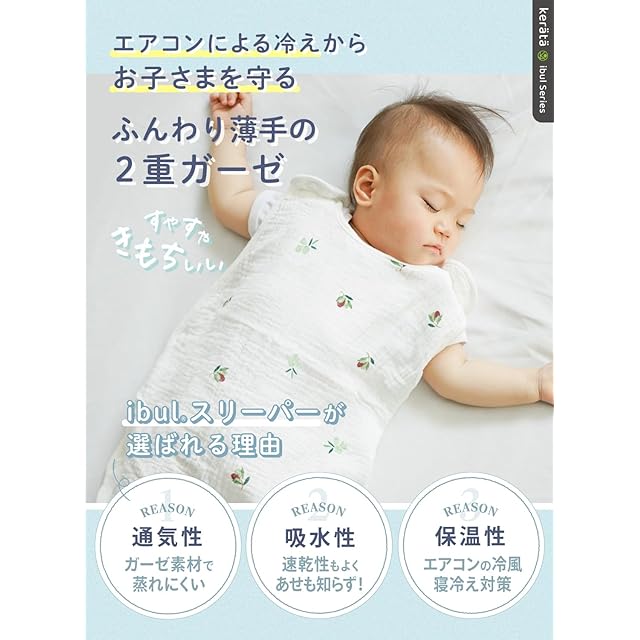 【昨年完売!2重スリーパー登場】ふんわりやさしいイブルガーゼを使用した、薄手タイプのベビースリーパーが今年も登場。2重ガーゼは夏のねんねにぴったり。モチーフデザインをちりばめた、さわやかなデザインが夏のねんねをいろどります。ふんわりとした2重の生地には空気層を含んでいるので、通気性が良く汗っかきな赤ちゃんでも安心です。しっかり汗を吸収するので、暑い夏でも快適。クーラーの効いた部屋でも寒さ対策としてお使い頂けます。「ちょうどこのくらいの薄手のものがほしかった!」とお客様からご好評いただいております。