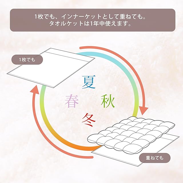 ふんわり柔らかな肌触りのタオルケットは、暑い季節は1枚で、秋冬は布団と合わせてインナーケットとしてもお使いいただけるので、オールシーズン活躍します。