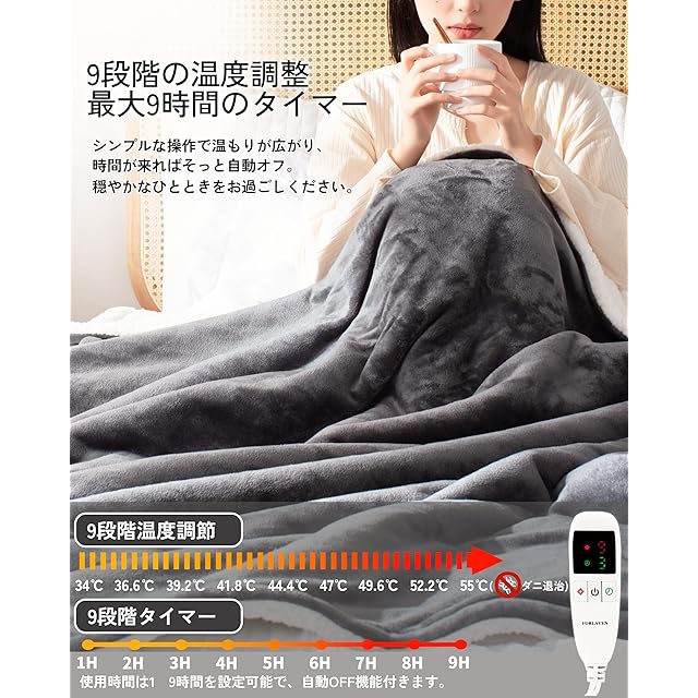 【9段階温度調整✙9段階タイマーで快適にカスタマイズ】約30〜54℃まで幅広い9段階の温度調節が可能で、読書・勉強・就寝などシーンに合わせて理想の暖かさを細かく設定できます。さらに1H〜9Hのタイマー機能付きで、自動的に電源が切れるため切り忘れを防止し、電気代の節約にも貢献。従来の「強・中・弱」しかなかった電気毛布とは異なり、細やかな調整ができます。