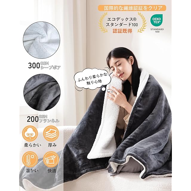 両面異素材で極上の暖かさと快適さ 表面はなめらかなフランネル、裏面はふんわりシープボアを採用した電気毛布。190×130cmの大判サイズで肩から足先までしっかりカバーし、ベッドでの使用はもちろん、ソファでのリラックスタイムやひざ掛けとしても活躍します。触れた瞬間から贅沢なぬくもりを体感できます。 9段階温度調節&9段階タイマー機能 約30〜50℃まで幅広く温度を調整でき、読書や勉強、就寝などシーンに合わせて理想の暖かさを選べます。1H〜9Hの自動オフタイマー付きで、切り忘れを防止し電気代を節約。従来の「強・中・弱」しかない電気毛布とは違い、きめ細やかな快適さを提供します。 自動断電システム 温度センサーと過熱防止システムを搭載し、異常を検知すると自動で電源がオフになる設計。夜間や長時間の使用でもご利用いただけるため、お子様や高齢者の方にもおすすめです。 70W省エネ設計で経済的 定格消費電力70Wの省エネ設計により、エアコンやヒーターよりも大幅に節電可能。東京電力の目安単価で試算すると、1時間あたりの電気代は約2.3円、就寝時6時間でも約14円程度。毎日使っても月額約400円と経済的で、冬の光熱費を賢く抑えられます。※2025年度東京電力 単価33.78円/kWhで算出。 高品質素材&丸洗い可能 直接肌に触れる寝具だからこそ、OEKO-TEX STANDARD 100認証を取得した素材を使用。有害物質を含まないため敏感肌の方や小さなお子様にも使えます。さらにコントローラーを取り外せば丸洗い可能で、付属の専用洗濯ネットを使用すれば毛布を傷めずに清潔を維持できます。 幅広い用途&ギフトにも最適 掛け毛布・敷き毛布・ソファブランケットとして多用途に使えるほか、オフィスの防寒、キャンプや車中泊にも便利。収納や持ち運びも簡単で、誕生日、クリスマス、敬老の日、新年のお祝いなどのギフトにも喜ばれる、実用性と高級感を兼ね備えた電気ブランケットです。
