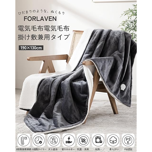 商品名:電気毛布 掛け敷兼用 洗える【大判 190×130cm】洗濯ネット付き 速暖 9段階温度調節 タイマー付き 節電 省エネ ダニ退治 防寒対策 丸洗いOK フランネル&シープボア 軽量 肩掛け 膝掛け シングル PSE認証済み (ダークグレー) Forlaven