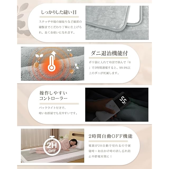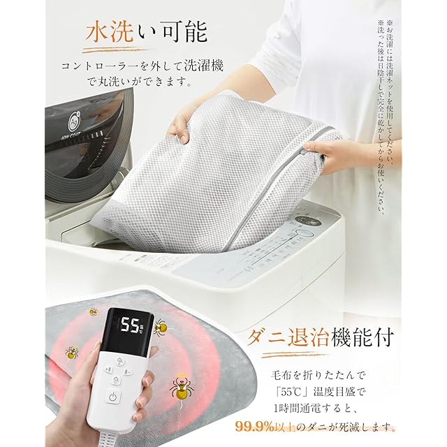 【ダニ退治機能・抗菌除臭・本体丸洗い可能】お肌の近くで使う寝具だから、肌にやさしくて清潔を保ち、健康のために高温でダニ退治機能もあり、毛布本体を折りたたんで、目盛「55℃」で1時間高温運転するだけで99.9%のダニを退治できます。さらにコントローラーを取り外し、電気しき毛布を洗濯ネットに入れて、自宅の洗濯機で丸洗いできますので、いつでも清潔にお使いいただけます(※乾燥機や洗濯機の乾燥機能は使用しないでください)。