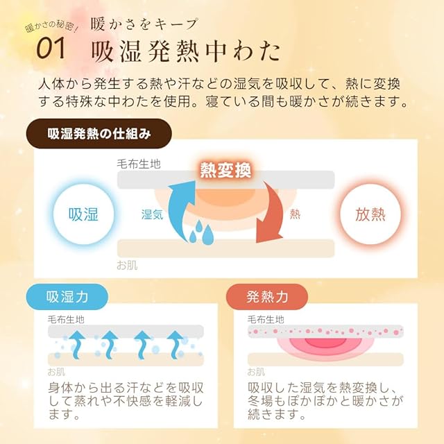 表地・裏地ともに優しくなめらかなフランネルタッチ♪毛布生地を2枚合わせて縫製する「2枚合わせ毛布」なので、2枚の生地の間に空気の層ができ、保温力UP♪衿付きで外から冷たい空気が入るのを防ぎ、体温で温まった空気を逃がしません。吸湿発熱効果のある繊維を中わたに使用。体温から生まれる熱や汗・皮膚呼吸による湿気によってほんのり心地よいあたたかさを感じられます。薄手寄りのフランネル生地を使用することで、軽くて扱いやすいのに、吸湿発熱わたであったかい毛布に仕上がりました。もちろんご家庭で丸洗いもOK!