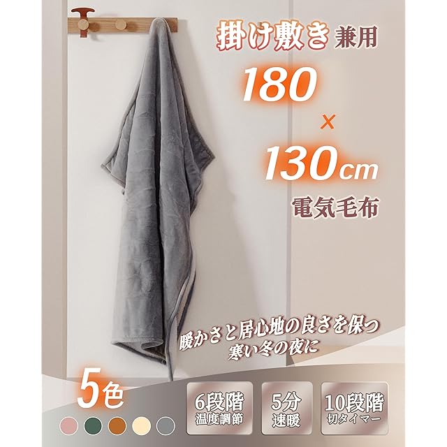 GOTCOZY 電気毛布 掛け敷き兼用 - 180×130cm フランネル電気ブランケット 6段階温度調整 10時間自動停止タイマー付 速暖 節電 丸洗い可能 暖房器具 防寒対策(グレー)