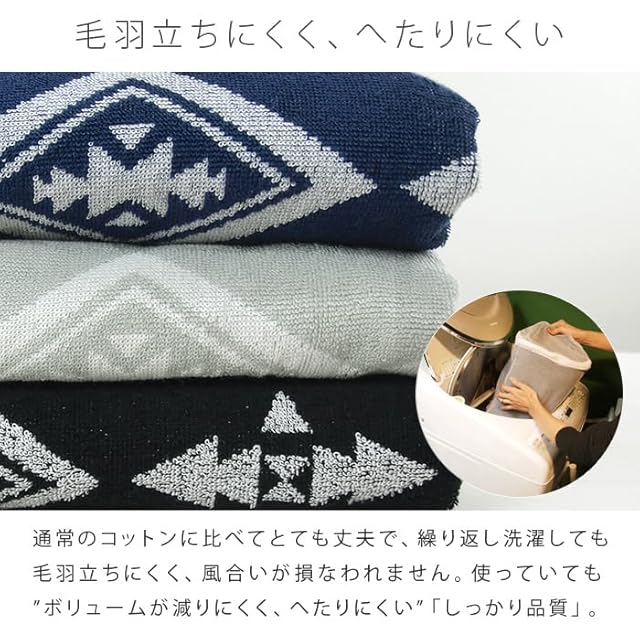 通常のコットンに比べて丈夫なため、お洗濯を繰り返しても毛羽立ちにくく風合いが損なわれません。使っていてもボリュームが減りにくく、へたりにくい。