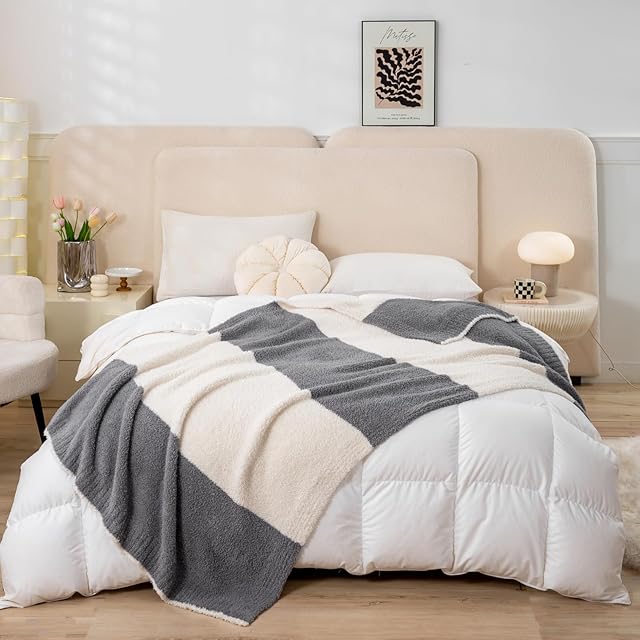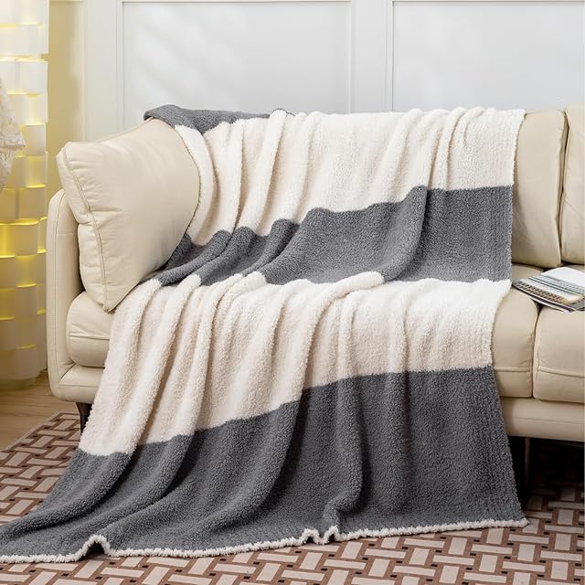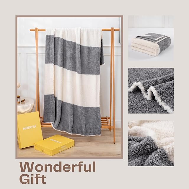 Mokoya おしゃれ ブランケット 大判 ふわもこ 毛布 夏用 タオルケット シングル 可愛い 掛け毛布 膝掛け 大判 プレゼント (ボーダーグレー, 130x180cm)