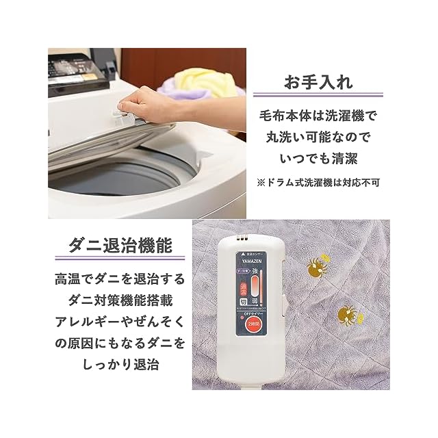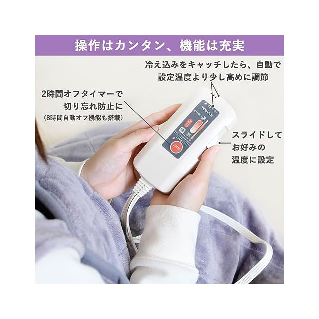 【温度調節&タイマー】お好みに合わせて弱から強まで無段階で調節できます。その日の気温や体調に合わせて、お好みで調節してください。また、高温でダニを退治するダニ対策機能付きでアレルギーやぜんそくの原因にもなるダニをしっかり退治します。2時間オフタイマーと8時間オートオフタイマー機能搭載であたためすぎや切り忘れの心配もありません。