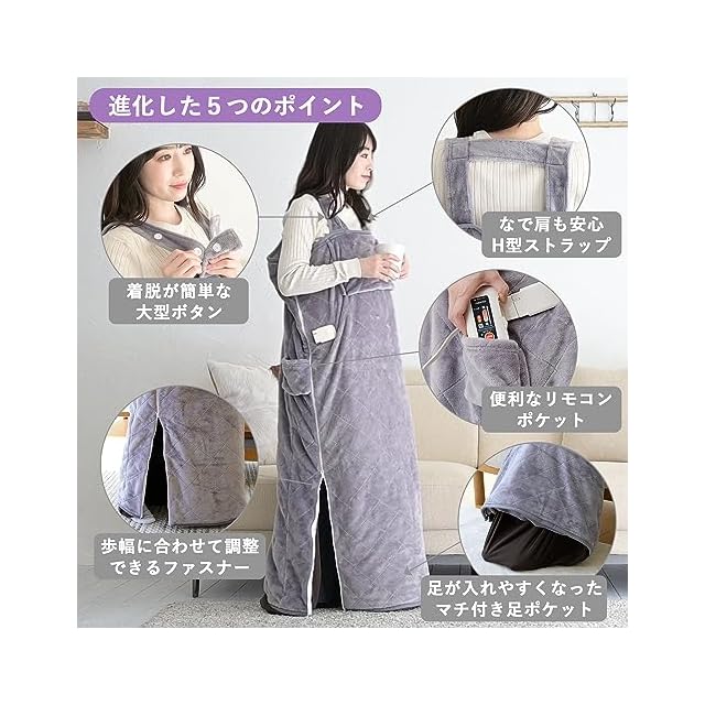 【商品仕様】▪本体サイズ:115×65cm(着用時ウエスト最大約130cm)▪適応身長目安:150~180cm▪電源:交流100V(50/60Hz)▪消費電力:40W▪電源コードの長さ:電源側=1.96m/本体側=0.65m▪消費電力量:強=約27Wh/適温=約18Wh/弱=約13Wh▪1時間あたりの電気代:強=約0.8円/適温=約0.6円/弱=約0.4円(室温15℃、綿ふとん中で5時間運転したときの平均消費電力量を1KWh=31円で算出)▪表面温度:強=約53度/適温=約33度/弱=約23度▪自動オフ:2時間オフタイマー/8時間自動オフ▪期間:お買い上げ日より1年間(の範囲については、書をご確認ください。(一般家庭用以外(業務用など)に使用された場合の故障及び損傷などは対象外となります))