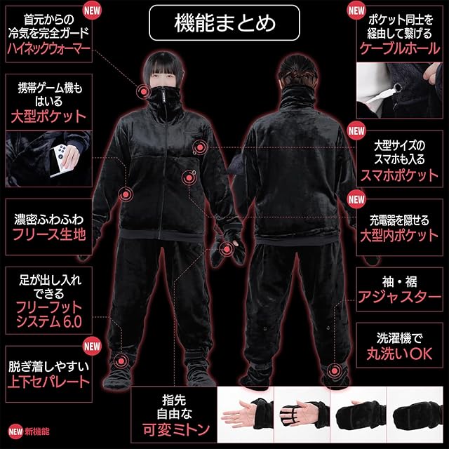 その他にも、携帯ゲーム機も入る「大型ポケット」、ヘッドセットをしたまま被れる「ゆったりフード」、片手でも調整しやすい「袖アジャスター」など、"ゲーミング着る毛布"の名に相応しい機能を取り揃えています。