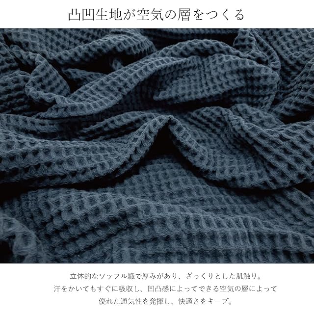 さらりとした肌触りのワッフルケットです。立体的な凸凹が特徴的で肌に触れる面積が少なく、さらっとした肌触り。吸水性にも優れているので、べたつきがちな季節も寝心地がよく、通気性が良いので雑菌が繁殖しにいのも◎。